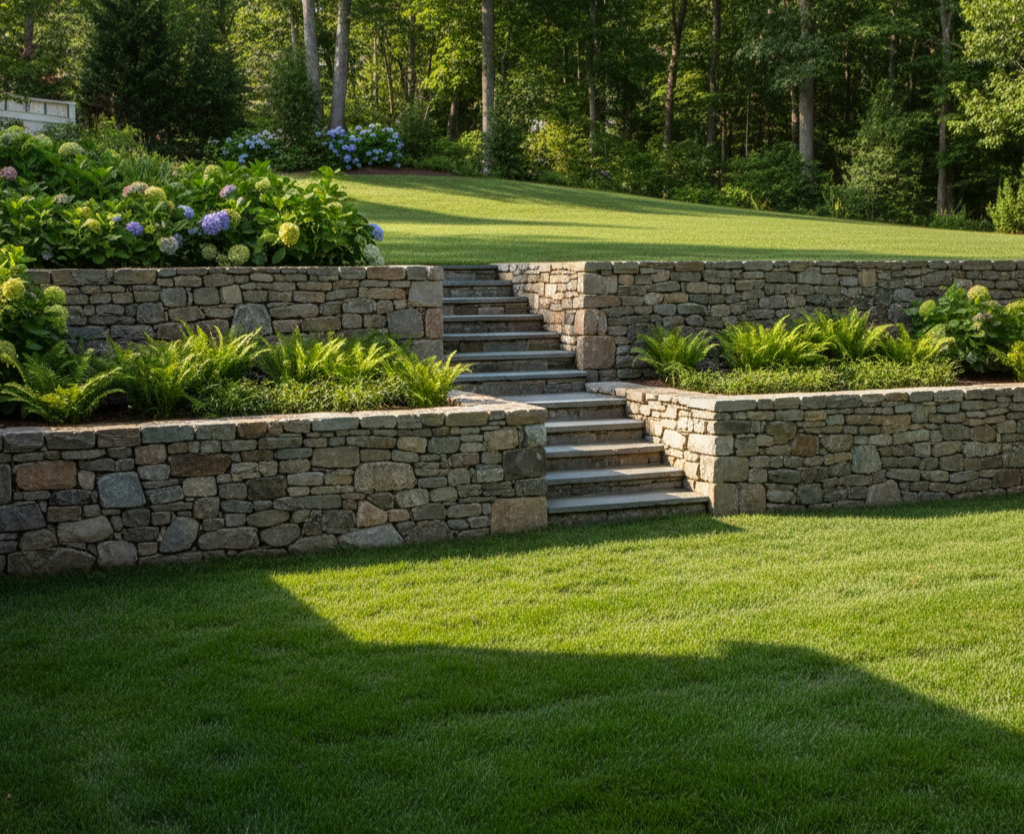 A structurally sound stone wall is a masterful blend of physics and artistry. For dry-stacked walls, success depends on the careful selection and interlocking of stones, ensuring each one is placed with a minimum of three points of contact and is battered (leaned back) into the hillside for stability. For mortared walls, we focus on creating a deep, concrete footing and/or posts below the frost line to prevent heaving, and we incorporate "weep holes" to relieve the hydrostatic pressure that builds up behind the wall. These time-honored techniques ensure the walls we build are not just beautiful features but enduring structural elements of your landscape.